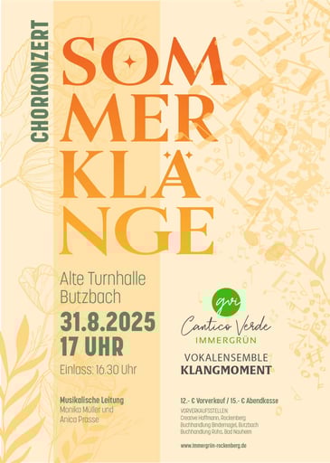 Am Sonntag, den 31. August 2025 um 17 Uhr laden der Chor Cantico Verde aus Rockenberg und das Vokalensemble Klangmoment aus Nidda zu einem gemeinsamen Konzert in die Alte Turnhalle Butzbach ein. Unter der musikalischen Leitung von Monika Müller und Anica Prasse erwartet die Besucher ein abwechslungsreiches Programm. Das Repertoire reicht hierbei von traditionellen Volksliedern wie "Kein schöner Land" oder "Bella Ciao" über bis hin zu modernen Pop-Balladen wie "Thank You For The Music" von ABBA oder dem irischen Abschiedslied "The Parting Glass“.